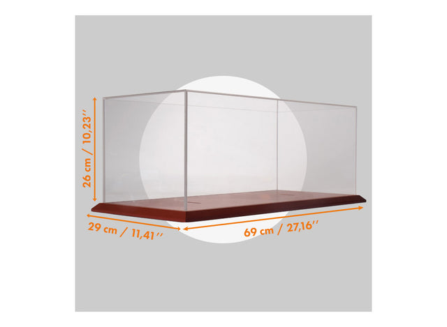 This clear perspex display case and its wood-effect plastic base will showcase your model in style.