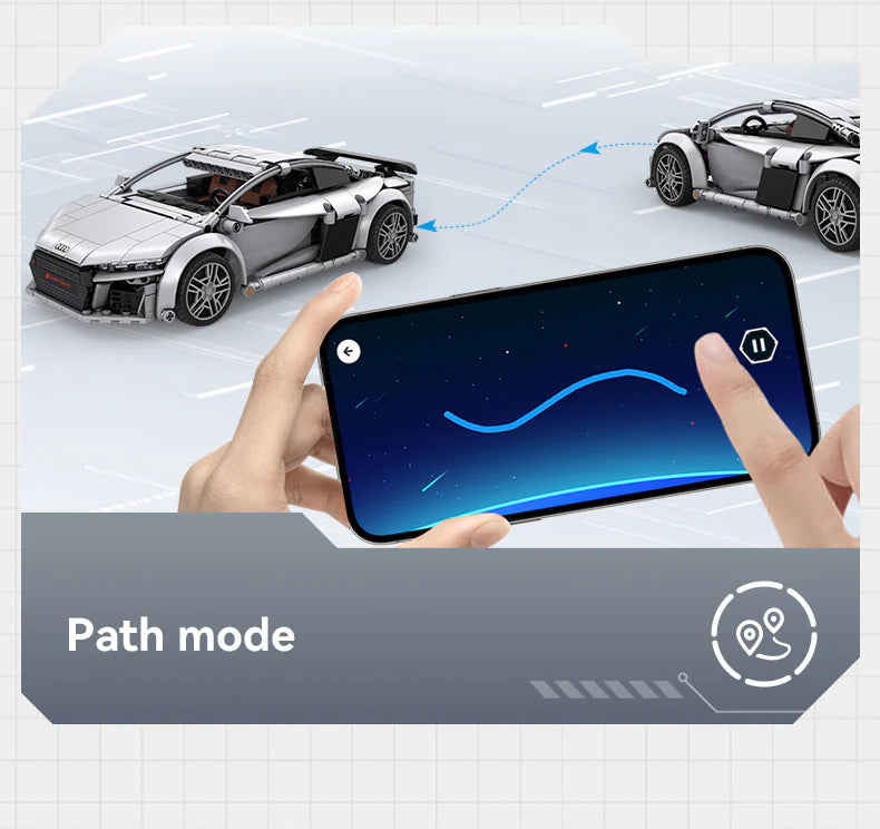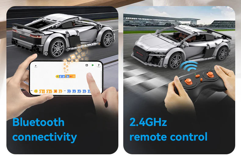 Officially licensed Audi R8 Coupe scale brick model with silver colour and printed pieces. A faithful 1:14 replica of Audi's mid-engined two-seater sports car that was in production from 2006 to 2024, it can manually steer and move forwards and backwards, but also has full remote control functionality making it ideal for play and display.