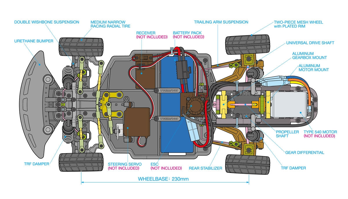 *Requires: Motor, 2-channel radio, steering servo, 7.2volt battery and compatible charger, Tamiya PS & TS paints to complete